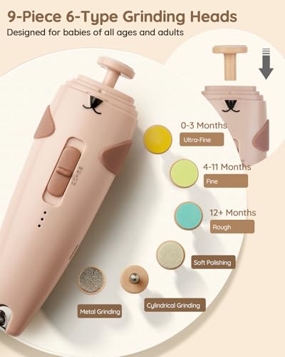 Versatile Grinding Heads: Equipped with six types of grinding heads, totaling 9 pieces, this baby healthcare and grooming kit is suitable for everyone from newborns to adults. As your child grows, simply switch to a larger head, ensuring effective and gentle nail care throughout all stages of life