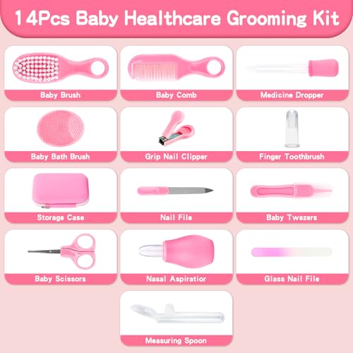 Baby Healthcare and Grooming Kit, 14 in 1 Baby Safety Set Newborn Nursery Health Care Set with Hair Brush Scale Nail Clippers for Baby Girls Boys (14 Kits Pink)