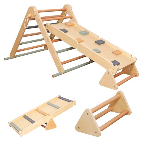 ✨Versatile of Triangle ladder – high triangle, low triangle and flat, triangle unfolded flat is a great obstacle course or bridge, can also be leaned against a wall and climbed up. if you put the climbing wall on small triangle, it creates a great balance beam, wooden playground is the perfect fun for little climbers.