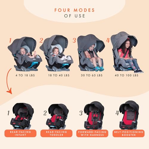 4-in-1 Seating System: Built for extended use including 1) Rear Facing Infant mode from 4 to 18lbs 2) Rear Facing Toddler mode from 18 to 40lbs 3) Forward Facing with Harness mode from 22 to 65 lbs 4) Belt Positioning Booster mode from 40 to 100lbs