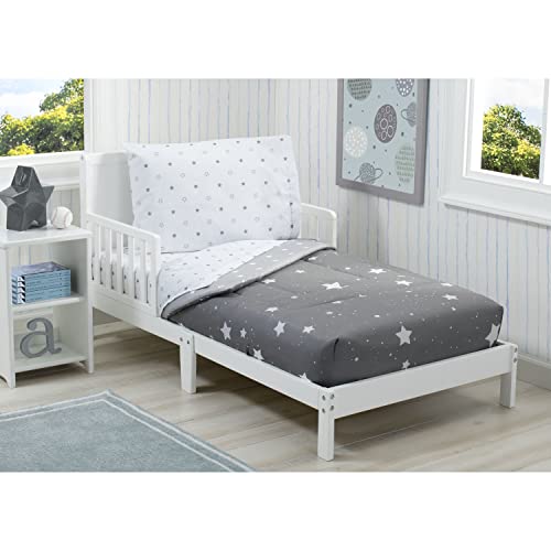Delta 4-Piece Reversible Toddler Bedding Set – Fitted Sheet, Top Sheet, Pillowcase, 2-in-1 Comforter – For Boys, Dusty Skies & Grey Stars