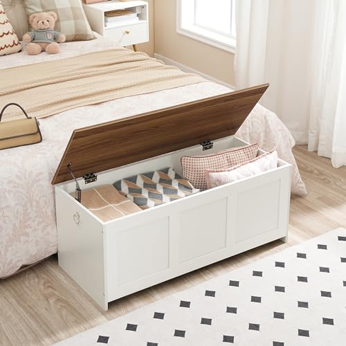 HOOBRO Storage Bench, 39.3″ Retro Wooden Storage Chest, Wooden Storage Trunk, Toy Chest with Lift Top, Multifunctional Entryway Organizer, for Entryway, Living Room, White and Walnut WH141CW01