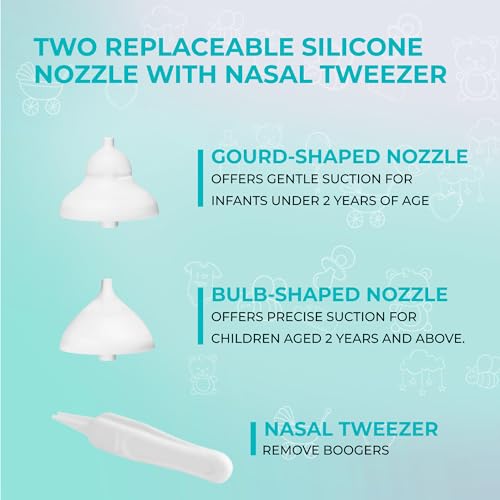 – 2 Food-Grade Silicone Tips for Gentle and Precise Suction: Presenting two food-grade silicone tips tailored to their age and nasal anatomy, the gourd-shaped nozzle ensures gentle suction for infants under 2, while the bulb-shaped nozzle offers precise suction and deep cleaning for children aged 2 and above
