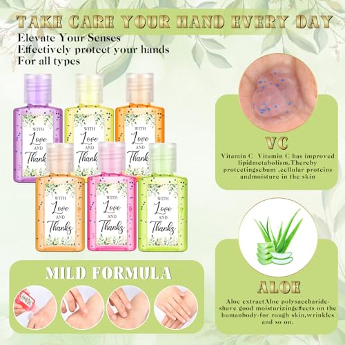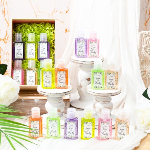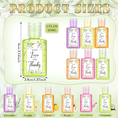 6 Scented and Handy Size: this set of bridal shower hand sanitizer offers 6 different scents: lavender, vanilla, citrus, peach, cherry blossom, and coconut, with 8 sanitizers of each fragrance; Each bottle is conveniently sized at 1fl oz, providing a sufficient quantity to meet your varied gift needs; It’s the ideal size to slip into a pocket or purse, ensuring your guests can clean their hands anytime, anywhere