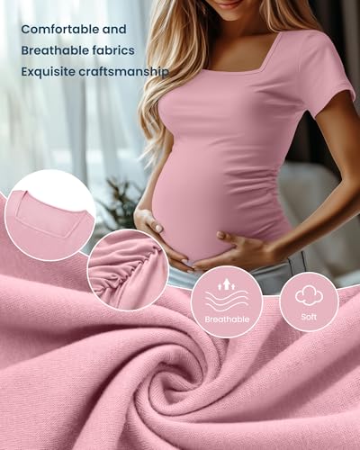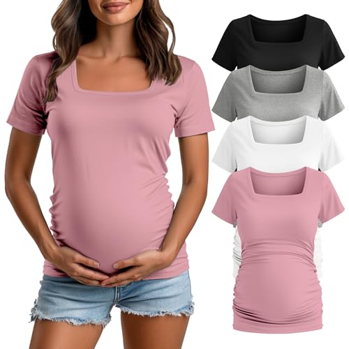 4 Pack Women’s Maternity Shirts Cotton Square Neck Pregnancy Tops Side Ruched Summer Short Sleeve Tees Multipack