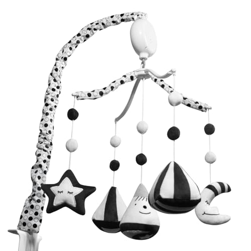 【PERFECT GIFT】 High-contrast black and white colors in our musical baby toys captivate and stimulate your baby’s developing sense of sight, makes a great unisex gift for baby showers, birthdays or baby registries. It’s not only a musical baby mobile, it’s also the cutest nursery decoration.