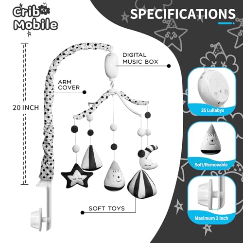 FEISIKE Baby Crib Mobile, Crib Toys Hanging with 35 Lullabies, 3 Modes Digital Musical Box(Turn Only, Music Only, Turn & Music Newborn Baby Toys Black/White for Boys and Grils