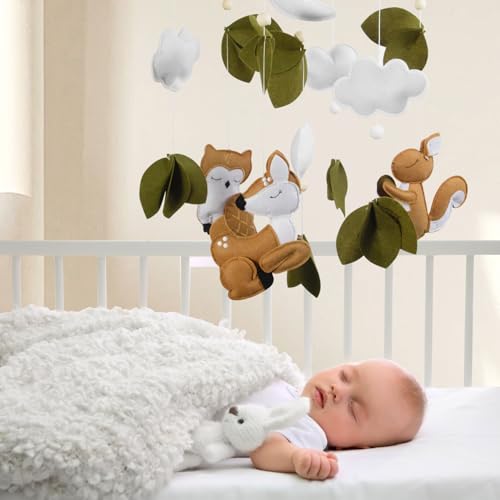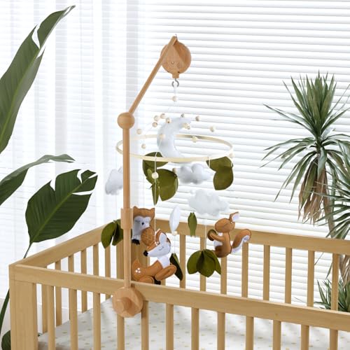 FEISIKE Woodland Animals Theme Bassinet Baby Nursery Mobiles with Modes Digital Music Box 3In1 Set-34 Inch Wooden Mobile Arm for Crib Mobile Hanger for Crib Baby Nursery Decor